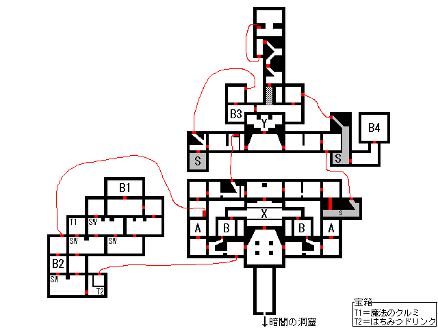A(左右両方)に居るグレートデーモンを倒すと、階段にあった炎が消えて部屋Bへ進めるようになる。