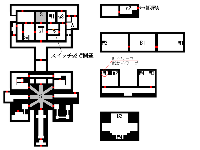 スイッチs3の部屋に入って左側のスイッチを押す。その部屋から部屋Aへ行く。部屋Aの左側はスイッチs2の部屋に入れるようになっているので、スイッチs2を押す。