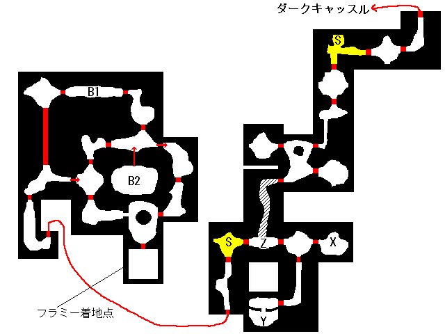 邪眼の伯爵を倒し、部屋Zに行くと、斜線部の道を進むことができるようになっている。